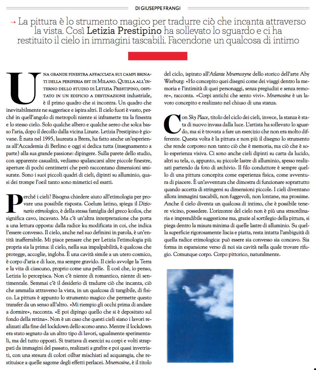 La serie Sky Place sfiora il problema della carne, collocandosi nella penombra. Piccole porzioni celesti sono pervase dalla luce, loro trionfo. Da essenziali pennellate di colore sorgono le carnalità di nubi e cieli.